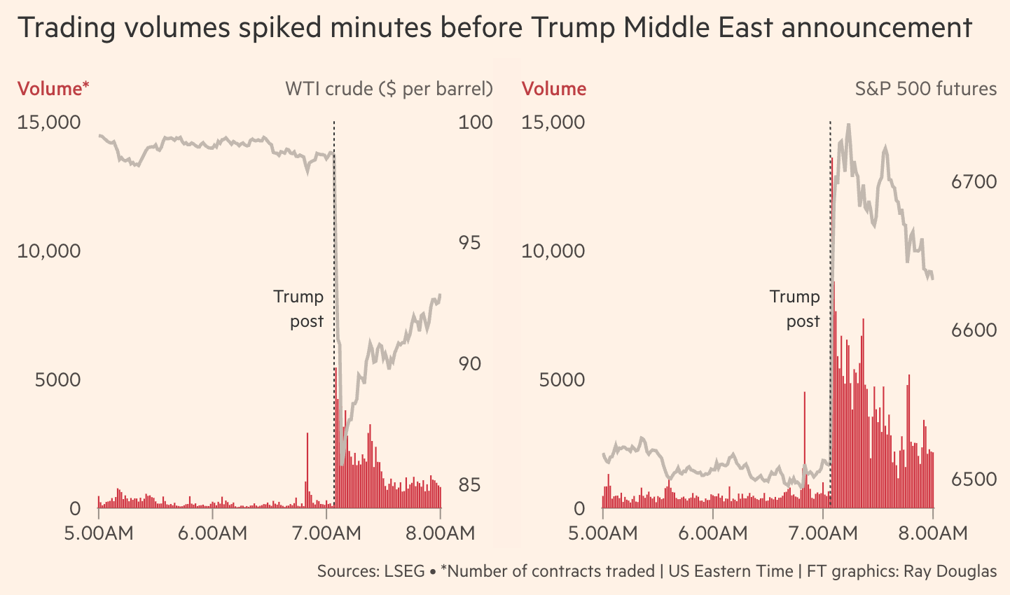Traders placed $580 million in bets in the oil market just minutes before Trump posted on social media claiming that productive talks with Iran had occurred, prompting a sharp decline in crude prices. (More on this below.)